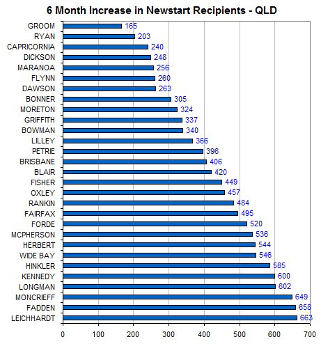 What was interesting here is how Queensland is faring. If we look at all of the seats across the country which have experienced an increase in Newstart numbers of 500 or more over the 6 months, 10 of those 16 seats are in Qld, including 6 of the top 7.