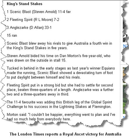 Overnight, Australian speedster Scenic Blast, ridden by Steven Arnold, triumphed in the King’s Stand Stakes ahead of Fleeting Spirit and Anglezarke.