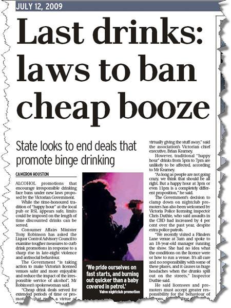 Last drinks: laws to ban cheap booze – promotions that encourage irresponsible drinking face bans under new laws proposed by the Victorian Government – Melbourne Sunday Age