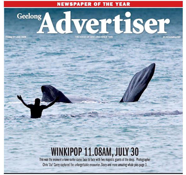 Whale wonder at Winkipop – It was his moment of glory. Anglesea surfer Kaine Hazle triumphantly threw his hands in the air as the fins of a southern right whale surfaced within arm’s reach at Winkipop yesterday morning – Geelong Advertiser
