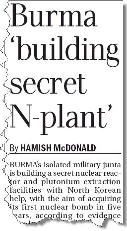 Burma ‘building secret N-plant’ – The secret complex, much of it in caves tunnelled into a mountain at Naung Laing in northern Burma, runs parallel to a civilian reactor being built at another site by Russia that both the Russians and Burmese say will be put under international safeguards – Melbourne Age