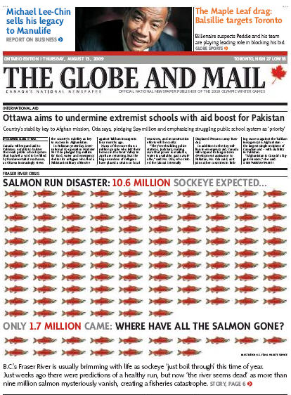 Fraser River’s salmon stocks ‘beyond a crisis’ – The mysterious collapse of the B.C. sockeye run has dashed hopes raised just weeks ago of a good return this year. Between 10.6 million and 13 million sockeye were expected to return to the Fraser this summer. But the official count is now just 1.7 million. Where the nine to 11 million missing fish went remains a mystery – Toronto Globe & Mail