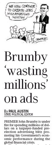 Brumby ‘wasting millions’ on ads – ohn Brumby is under fire for spending millions of dollars on a taxpayer-funded pre-election advertising blitz promoting his Government’s economic performance during the global financial crisis. The Opposition has branded the $4 million campaign a blatant misuse of public money to “spruik” the Government in the lead-up to next year’s election and is urging the Auditor-General to investigate – Melbourne Age