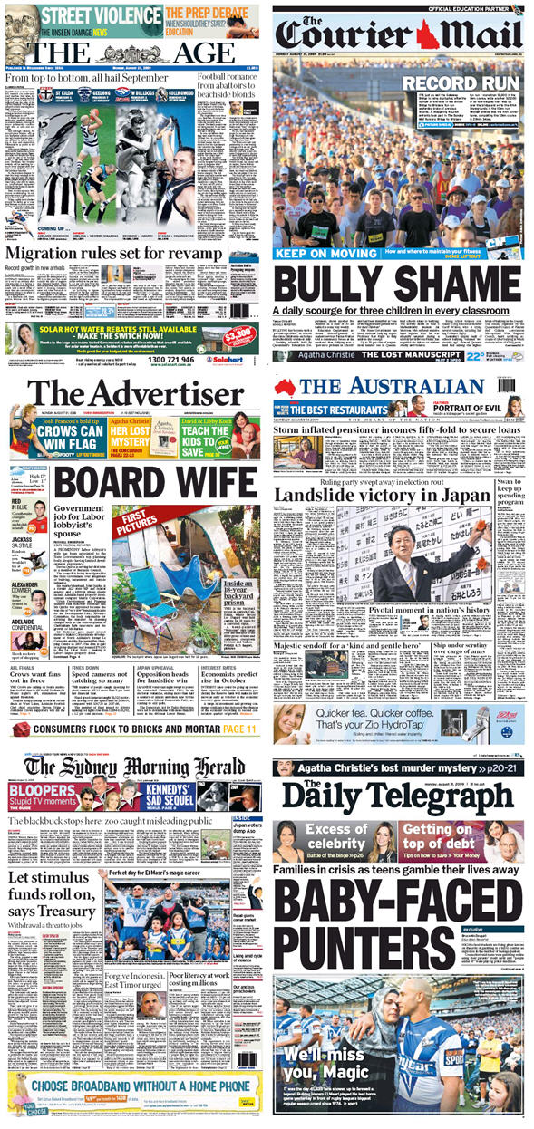 Ruling party swept away in Japanese election rout – The Australian reports Japan’s long-dominant Liberal Democratic Party was headed last night for a shattering defeat, losing about two-thirds of the seats it held before Prime Minister Taro Aso called an election six weeks ago.