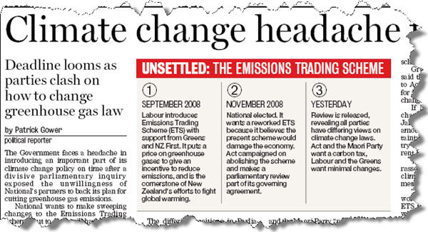 Climate change headache for Key – The New Zealand Government faces a headache in introducing an important part of its climate change policy on time after a divisive parliamentary inquiry exposed the unwillingness of National’s partners to back its plan for cutting greenhouse gas emissions – New Zealand Herald