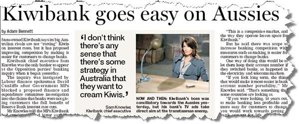 090903nzheraldKiwibank goes easy on Aussies – State-owned Kiwibank says its big Australian rivals are not “rorting” Kiwis on interest rates, but its Chief Executive told MPs Kiwibank had consistently had lower variable interest rates than its big Australian-owned competitors, despite having to pay the same for money it borrowed – New Zealand Herald
