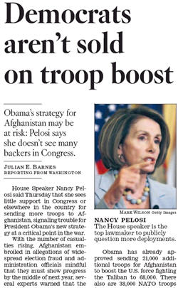 Doubt raised on troop boost in Afghanistan war – President Barack Obama’s strategy may be at risk as House Speaker Nancy Pelosi says she doesn’t sees many backers in Congress for any new deployments – Los Angeles Times