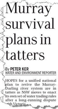Murray plans in tatters – While the NSW and the Commonwealth hailed the deal as a boost for the environment, green groups claimed it was a step backwards for the river – Melbourne Age