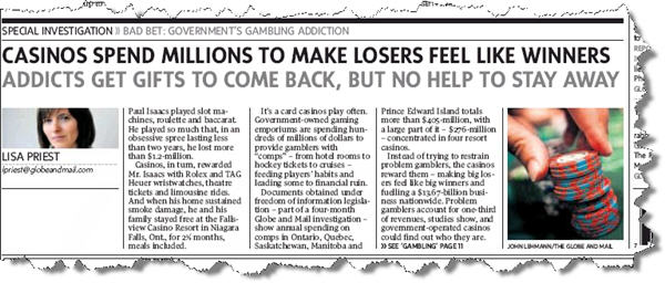 Casinos spend millions to make losers feel like winner – Governments have made some efforts to curb compulsive behaviour. In Ontario, the government spent $39-million in fiscal 2009 on treatment, research and prevention of problem gambling, with the Ontario Lottery and Gaming Corporation adding a further $9.6-million on responsible-gambling initiatives (the highest figure in North America, it says). But the same year, it laid out $558-million on marketing and promotion of casinos, more than half in comps – Toronto Globe and Mail