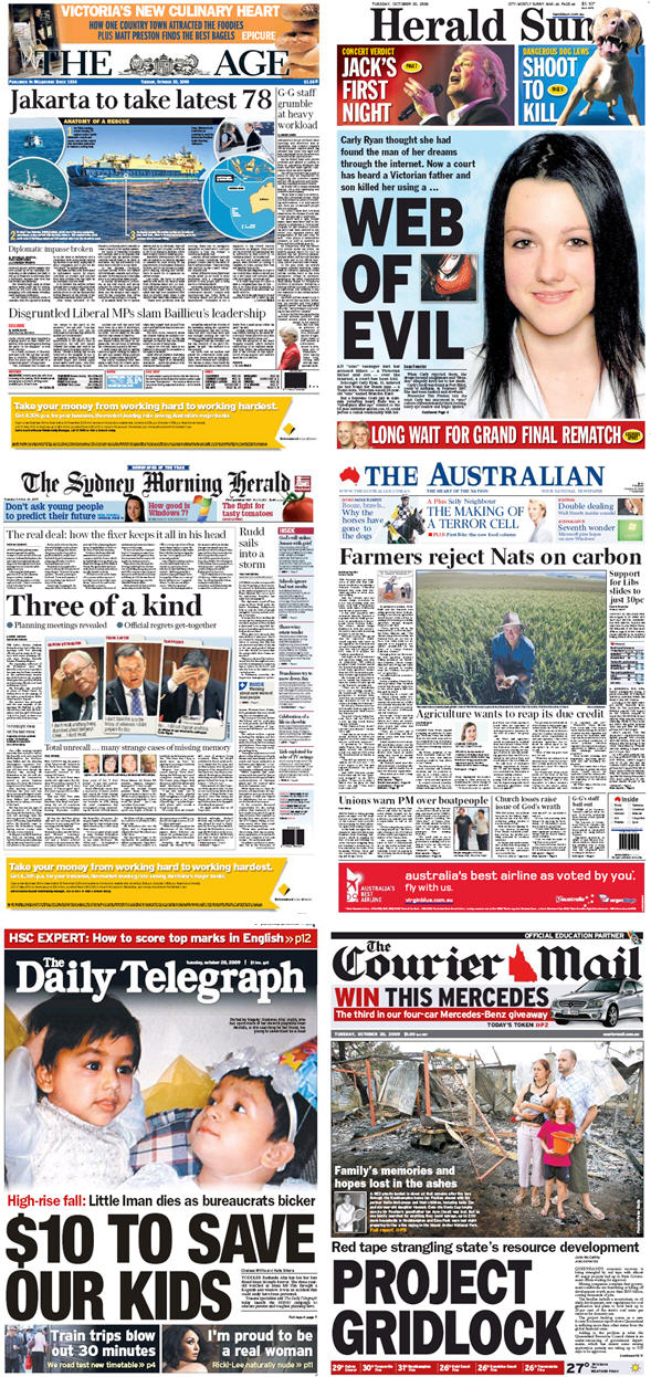 Support for Liberals slides to just 30pc: Newspoll – Support for the Liberal Party has dropped to its lowest level since June last year. Dissatisfaction with Malcolm Turnbull has leapt back to near what it was in the aftermath of the fake email affair in August, as the Coalition remains divided on an emissions trading scheme. Even a small rise in dissatisfaction with Kevin Rudd’s management, during a period dominated by boatpeople arrivals in Australian waters, has failed to help the Coalition – The Australian