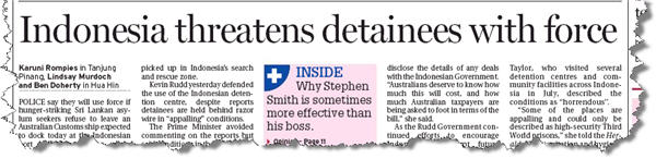 Rudd’s ‘Indonesia solution’ could be lifesaver – Kevin Rudd’s “Indonesia solution” has been given the provisional thumbs-up from key players in the refugee lobby, who say intercepting asylum-seekers in the archipelago could save lives. As new details about the controversial approach began to emerge, Refugee Council president John Gibson cautiously welcomed the deepening partnership with Jakarta – The Australian