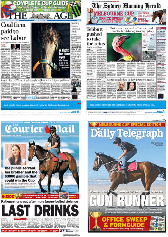 Sydney / Melbourne feud? I spurted milk out my nose with laughter when I saw the newpapers’ front pages. Every newspaper in the country puts a big picture of a horse on the front. Except the Sydney Morning Herald. Who puts a big picture of a turkey! What does this say about Sydney’s take on the stuff that will happen in Melbourne tomorrow? Thanks Richard for this column, it’s funny and a great way to see what’s going on – sometimes providing more information than it seems on the surface…
