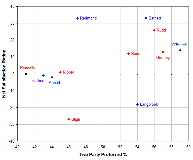 A different way to look at how the various political leaders are travelling is to contrast their net satisfaction or approval levels against their two party preferred vote share. The polls here cover a rather large time spread – from the very recent Newspolls from NSW, Vic and SA through to the most recent WA polls that came out back in March 2009 (March 2009!). Unfortunately we don’t yet have net satisfaction/approval ratings for the new NSW premier, so we’ll be optimistic and give her a notional zero on that score. Once we tally them all, this is what we end up with.
