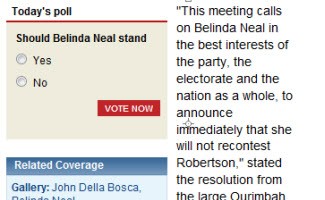 We have the answer but do we know the question? With the rest of the media dutifully following up Crikey’s tip yesterday that Central Coast academic and former state election candidate Deborah O’Neill would be taking on Belinda Neal for preselection in Robertson, Daily Telegraph readers were already laying the groundwork for an internal revolt. Or were they? Check out the following series of screen grabs from yesterday’s Tele story which included a yes/no poll asking the question “Should Belinda Neal stand?” Problem being, that hours later the question had mysteriously changed to the somewhat different “Should Belinda Neal stand down?”.