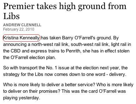The Sydney Morning Herald misspelled the Premier’s name in a story on her cancellation of the metro project in today’s edition, and also on its website. This has been going on since she became Premier, since when she has variously been reported as Christiana Kenneally, Christina Keneally and Kristina Kenneally.