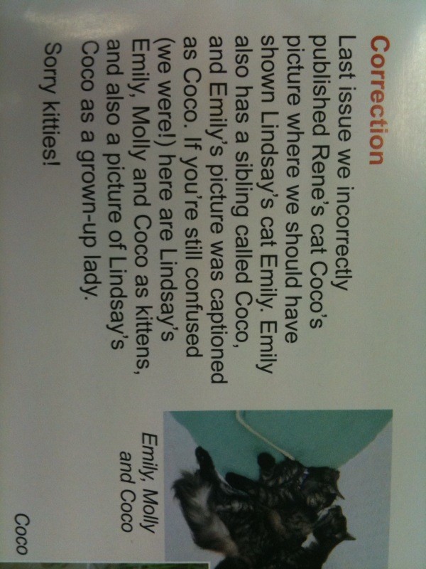 Feline fraud. An important correction from our favourite periodical, the Cat Protection Society of NSW’s Cat Affairs: