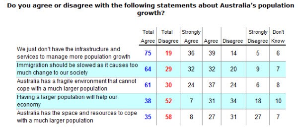 But the debate has to be informed by constructive research, not survey questions like: “We just don’t have the infrastructure and services to manage more population growth” — Why ‘just’? If the population growth rate is stable, why ‘more population growth’ when you mean ‘more population’? Or “Australia has a fragile environment that cannot cope with a much larger population — if something’s ‘fragile’ and subject to something ‘much larger’, how can it possibly cope?”