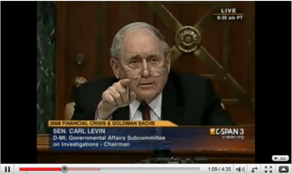 Watch US Senator Carl Levin grill Daniel Sparks, the former head of mortgages at Goldman Sachs, over an internal Goldman email where employees discuss the “shitty deal” they just made. [youtube]https://www.youtube.com/watch?v=gLx2Xc1EXLg[/youtube]