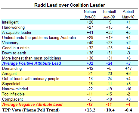 Ultimately, this suggests that what the public believes about Rudd is much more important in terms of delivering votes to the ALP over the spectrum of 50-56 % of TPP than what the public believe about the Opposition leader. It also suggests that while Oppositions can get away with running purely negative campaigns and have a fair level of success with them, governments can not – they also need to deal with the positive side of their leaders public perception ledger.