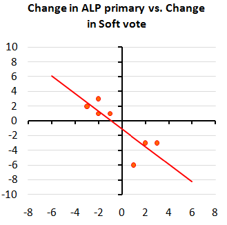 If we compare the changes in the primary vote of each party vs the change in its soft vote over these polls, it reinforces the point – the change in the soft vote is on the vertical axis, the change in the primary vote is on the horizontal axis: