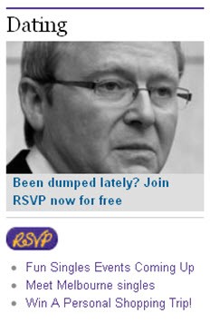 Rudd’s dumping. I think we have a winner for tackiest use of the Rudd political assassination — the RSVP dating website on the Fairfax network…