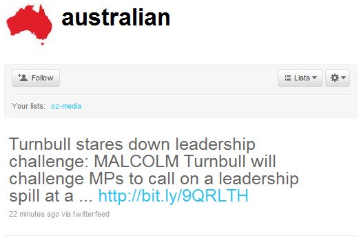 Kevin Andrews’ belated challenge. The news broke via Twitter at 4.52pm yesterday: Kevin Andrews was preparing to challenge for the Liberal Party leadership. Except it was Malcolm Turnbull’s leadership he was challenging, and The Australian was about seven months late. Samantha Maiden’s story — dated yesterday — was quickly deleted along with the tweet, which alerted its 9500-odd followers.