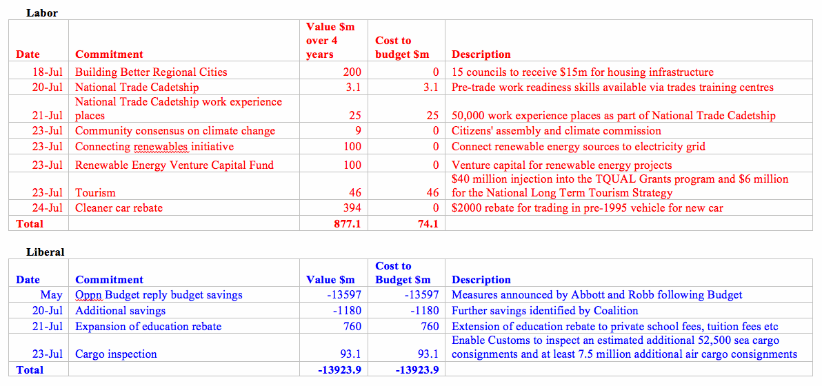 At the end of first week, Crikey’s Election Commitment Scorecard shows Labor well ahead in its spending commitments, with the Opposition yet to make much of a dent in its savings measures which, while they don’t come within cooee of the proclaimed $47b, will yet provide it some room for some decent announcements.