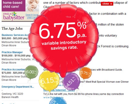 Bust Fairfax’s ad balloons. Check out the Fairfax news sites today, which seem to have introduced an even more insidious and infuriating advertising practice that ruined my Monday morning news scan. Readers now open a story and get about five seconds of reading before the story is blocked by a big ad for Virgin Money, interrupting the story mid-sentence and causing the reader to have to physically close the ad. — Terry Toweling