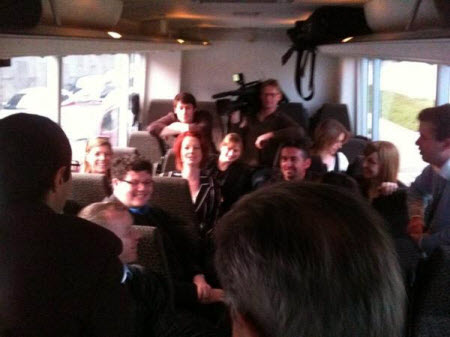 All aboard the campaign love bus. Apparently Real Julia consists of Julia Gillard and her team hanging out on the campaign bus with all the journalists. “Journos will be on their best behaviour on the media bus this morn — Ms Gillard herself has joined us,” tweeted Seven news journo Jodie Speers. But don’t expect them to be asking the tough questions: “Media circus has a whole new meaning. Cameras and spotlights in action on the bus — anything said is off-the-record tho,” she clarified. It might be off-the-record, but you couldn’t wipe the smiles off the faces of the journalists, judging by Latika Bourke’s tweetphoto: