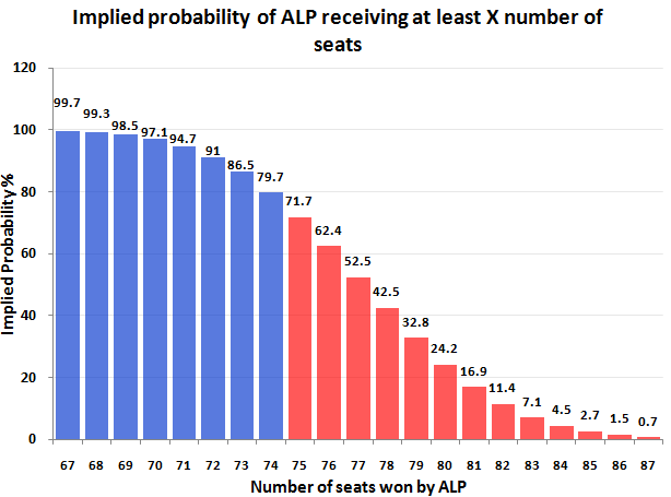 To read the chart, choose a number at the bottom of the chart — the left-hand axis tells you the implied probability of the ALP winning at least that many seats were an election held over the past fortnight and the election result was consistent with the polling results.