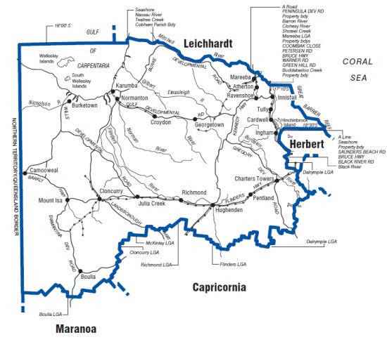 Where? Northern outback Queensland. According to the AEC website, Kennedy covers an area of approximately 562 160sq/km from the Gulf of Carpentaria and Mareeba in the north to Boulia in the south and from the Queensland border in the west to the Pacific Ocean in the east. The main towns include Atherton, Babinda, Camooweal, Charters Towers, Cloncurry, Georgetown, Gordonvale, Hughenden, Ingham, Innisfail, Mareeba, Mount Isa, Normanton and Tully.