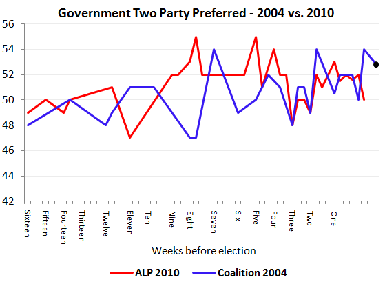 The spooky similarity between the ALP 2010 versus Coalition 2004 polling patterns continue. The last Newspoll in 2004 produced a 50/50 result. Taking today’s Newspoll at face value for a bit of fun and overlaying the two series we get: