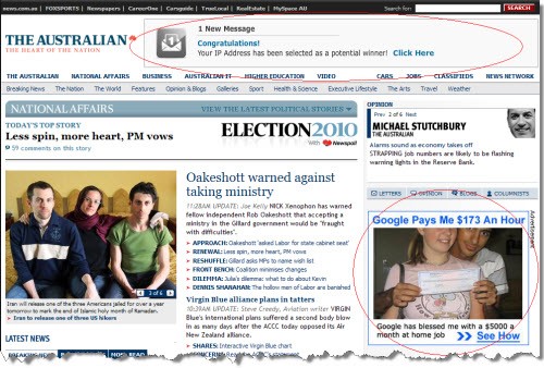 Congratulations! You’ve won a prize! Has someone hacked The Australian‘s website or is Rupert so hard up for cash that he’s taking spam advertising on his premier online news site?
