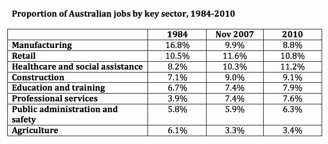 In 1984, manufacturing was king, with more than 1 in 6 of all Australian workers engaged in the sector. But its steady decline was already under way by then and the Hawke government’s micro-economic reform agenda only confirmed a long-term trend. The fall in manufacturing’s significance –0 in 2006 it dropped below 10% of jobs — continues with each quarter’s numbers. Meantime, professional services, such as lawyers and consultants, have almost doubled in the past 25 years.