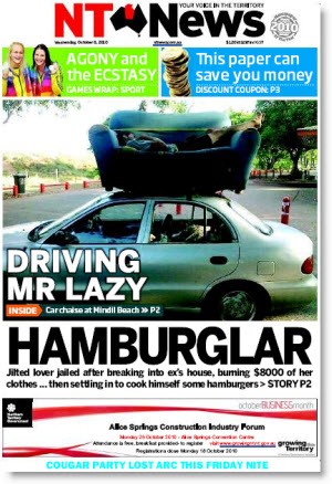 NT News watch: A classic cover from our favourite newspaper: man asleep in sofa on car roof, plus a story about a robber who cooks himself a burger. Simple, elegant, beautiful…