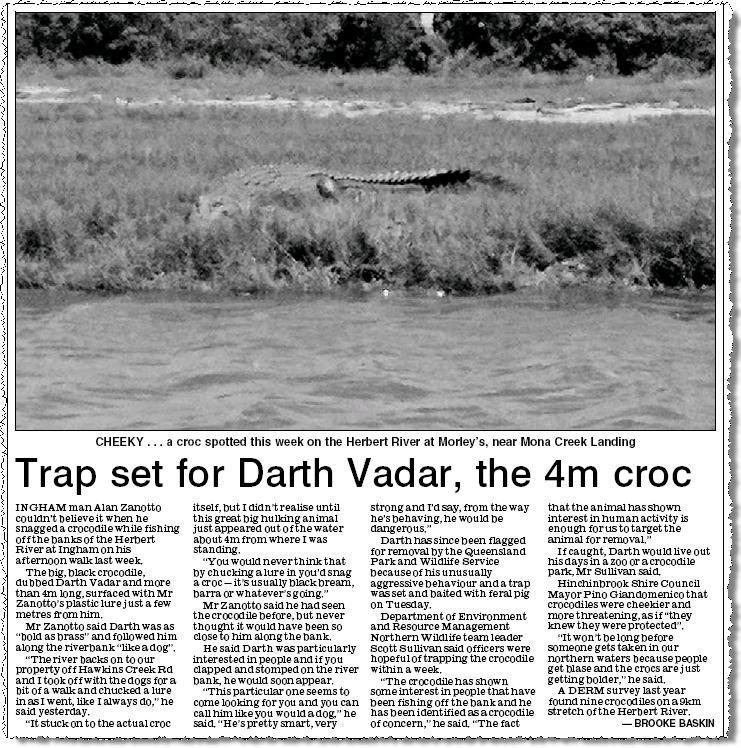 Cairns Post out NT Newses the NT News: A black croc called Darth Vadar. Impressive, although not for the spelling. It seems Vadar slipped underneath the radar. It should be Vader: