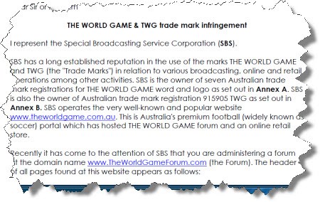 The SBS word game. SBS has again claimed the rights to the phrase ‘the world game’, this time in a sternly worded legal letter to the administrators of a not-for-profit online soccer forum. The demand comes after the public broadcaster pressured Crikey last year to remove “the world game” from its tags section, because it claimed use of the phrase was a breach of SBS trademark.