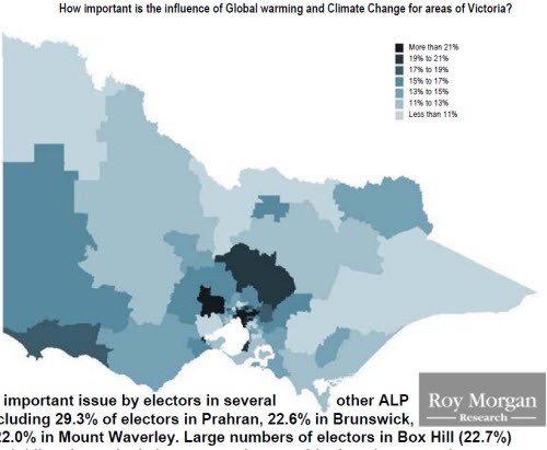 Melbourne’s ring of inner-city seats increasingly populated by iPhone-wielding professionals remain a hotbed of climate concern as the fight between Labor and the Greens warms up before next month’s state election, according to exclusive Roy Morgan research prepared for Crikey.