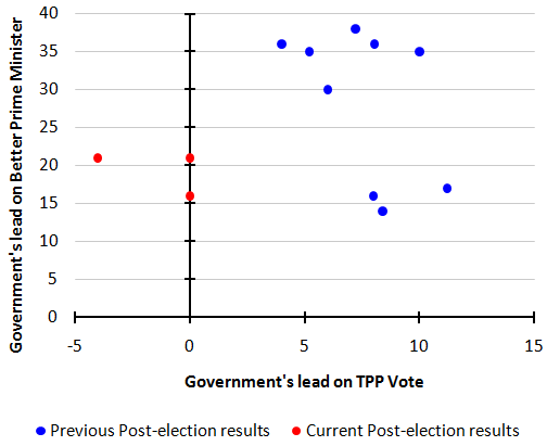As you can see, the current polling results are a little isolated compared to previous years of a returning government. There’s some more complex relationships between them as well that are also a bit odd at the moment, like how changes in one metric aren’t flowing through into changes in other metrics at a rate and consistency that we generally witness – but that isnt unusual for polling taken early in the term of a government. It usually takes three months or so for the public to start paying political attention again after an election, snapping the dynamics back to their usual spectrum of behaviour.