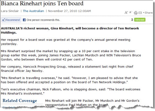 Like mother like daughter. Mining magnate Gina Rinehart was granted a seat on the Ten Network board on Friday — not her daughter Bianca, as The Australian would have you believe…