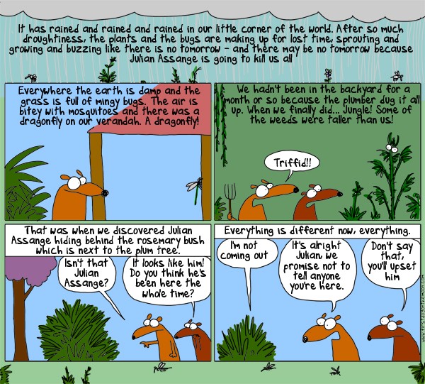 I was going to write a piece of first doggerel about the Assange bush, but I couldn’t get anything to go with “Agent Orange”.