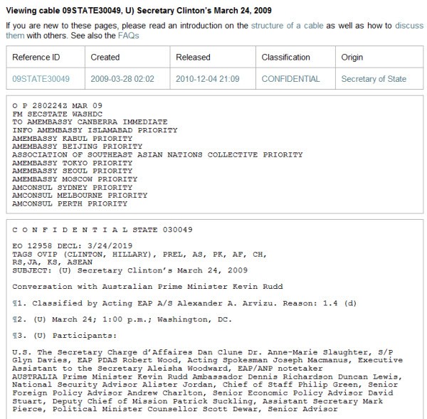 Though large parts of the site remain out of access, it now includes raw copy of the thousand or so cables on which last week’s news stories were based. These include reports from US Secretary of State that Australian Prime Minister Kevin Rudd suggested that military action against China may be a necessary last resort in the future. Rudd’s comments came in response to questions in which Hillary Clinton explicitly acknowledged that China’s position as major US creditor posed major foreign policy problems for the United States.