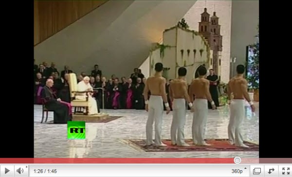 This is a has-to-be-seen-to-be-believed video. Watch a recent performance at the Vatican, where male dancers in tight white pants take off their jackets and perform an acrobatic routine topless to Pope Benedict XVI. The nuns wave excitedly and take photos.