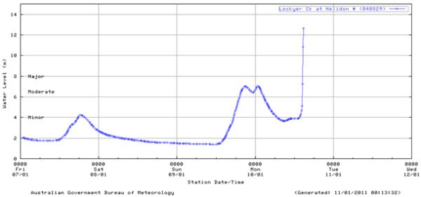 The Bureau of Meteorology issued a flood warning for moderate to severe flooding in Lockyer Creek at 4.16pm. It upgraded to a top priority flash flood warning at 5pm, to be broadcast with the SEWS emergency weather siren, warning of the extreme rises in Lockyer Creek with very fast and dangerous rises possible downstream at Gatton.