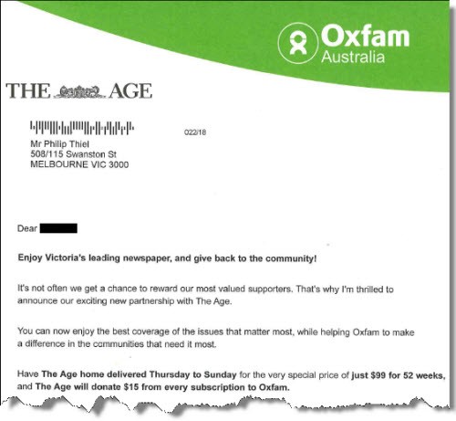 The Age gets charitable. In my letterbox yesterday: a letter concerning a “partnership” between Oxfam Australia and The Age, in which $15 of a $99 Thursday-Sunday Age subscription would be donated to Oxfam. Lovely.