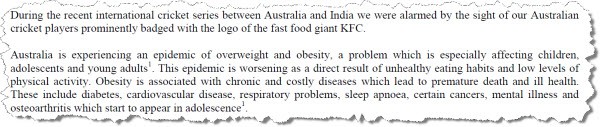 One of the study’s co-authors is Professor Stephen Colagiuri, one of the government’s advisers on diabetes, who has been fiercely critical of Cricket Australia for accepting money from fast food giant KFC. In March 2008, he wrote to the Medical Journal of Australia asking Cricket Australia to “consider its responsibilities to Australia’s children and youth and review its sponsorship by KFC”.