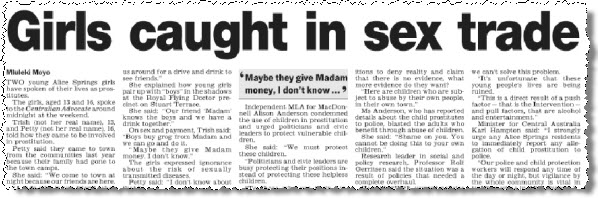 On Tuesday, the 8,000-circulation Advocate reported (not online) that 13-year-old Trish and 16-year-old Petty (not their real names) had been plied with alcohol by a pimp called “Madam” and offered up to “boys” outside the town’s Royal Flying Doctor Service.