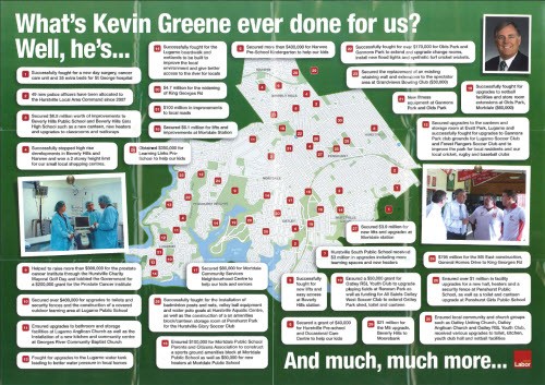 Labor man going Greene. Kevin Green(e) is a Labor Party candidate. Not that you’d know it from his election material…