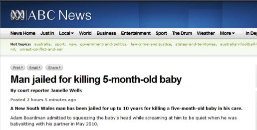 Wrong headline ABC. A tragic tale of a baby that was assaulted by his babysitter became even worse yesterday, when the ABC reported the court case saying the baby had been killed.