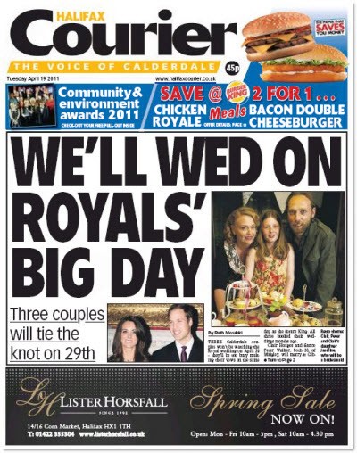 Front page of the day. The honour goes to the UK’s Halifax Courier, which duly reports that Will’s and Kate’s Royal wedding coincides with the big day of three local couples. After all, all news is local…
